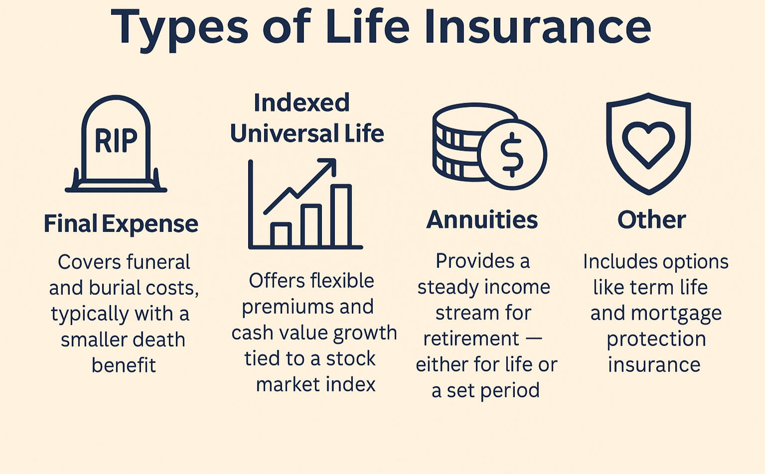 | Indexed Universal Life (IUL) | Flexible life insurance that builds cash value tied to market performance with downside protection. |